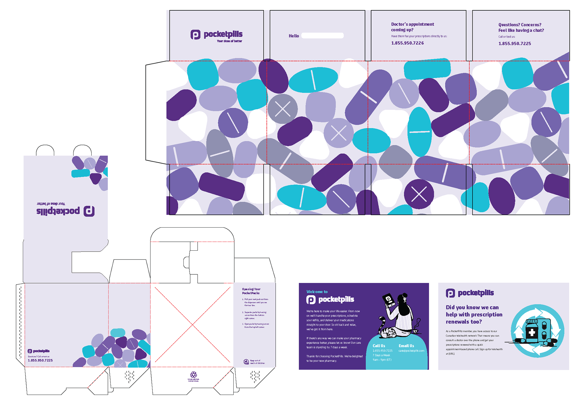 Full rebrand of the largest Canadian online pharmacy. From welcome kit, dispenser boxes and logo development to TVC and online advertising.