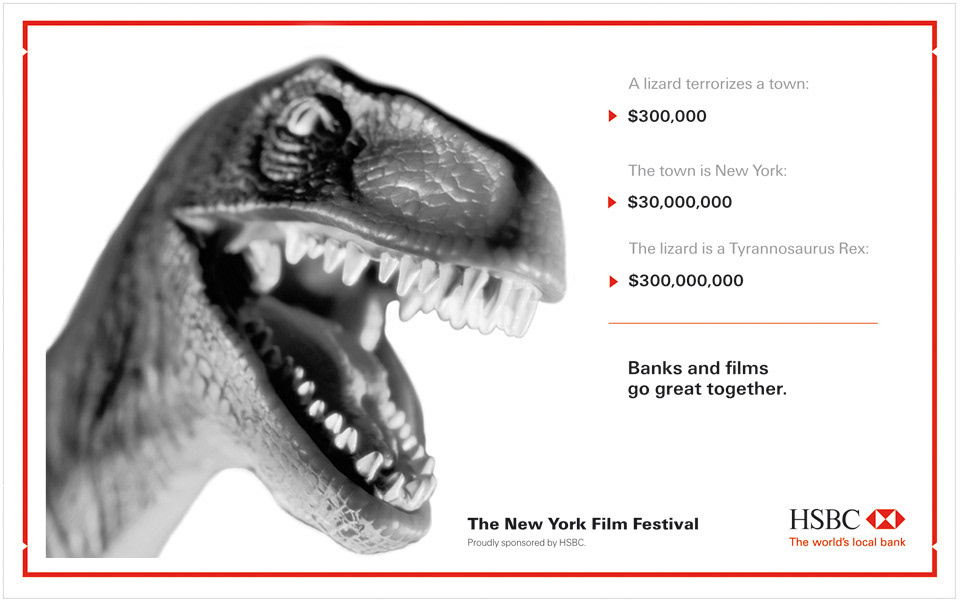 Sponsoring NYFF was the perfect way to build up the local reputation of HSBC. By boldly stating that banks are an inseparable part of movie making the ad campaign increased HSBC's recognition as a big player in New York. The outdoor, poster and print executions created a buzz in the local press. A short commercial ran before each movie screening cementing HSBC's role as a sponsor of the arts in the Big Apple.