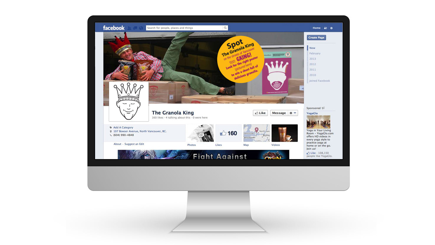 Next stage was promo cards, given away with each purchase of a granola bag. Each card had a different silhouette of a king. Only one had the true king from The Granola King logo on it. If you spotted the true king and mailed back the right card - you got the king's gift - a 10lb bag of granola. The Facebook page, microsite and Tweeter account promoted the contest and reflected the excitement around it.