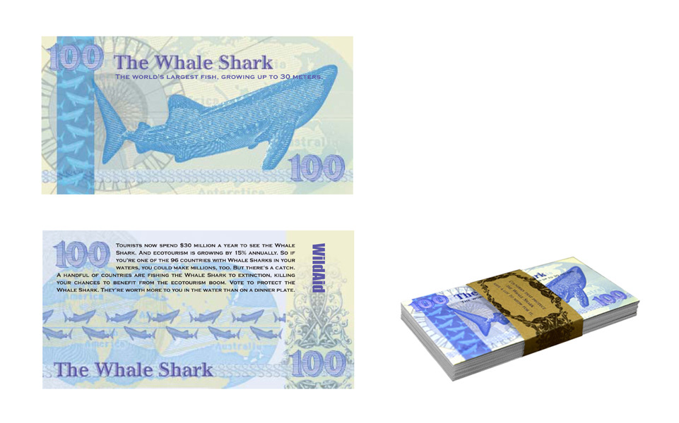 A different money concept was used for the following UN meeting - real money was stencilled with a message reminding the delegates of the Whale Sharks's worth.